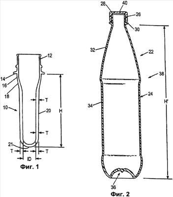 Заготовка 10 изготовлена способом литьевого формования бутылочного ПЭТ сополимера согласно одному из аспектов настоящего изобретения. Такие заготовки содержат резьбовой венчик 12, снизу заканчивающийся укупорочным фланцем 14. Под укупорочным фланцем 14 имеется в основном цилиндрическая часть 16, заканчивающаяся частью 18 с постепенно уменьшающимся наружным диаметром, обеспечивающим увеличение толщины стенки. Под частью 18 имеется вытянутое тулово 20. Высота заготовки измеряется от укупорочного фланца 14 до закрытого конца 21 вытянутого тулова 20.