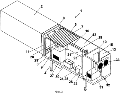 8. Загрузочно-разгрузочное устройство по любому из пп.1-7, характеризующееся тем, что внутреннее пространство контейнера (5) разделено разделительными перегородками (9, 10) как минимум на шлюзовое отделение (11), в которое входит распределительная головка (20) телескопической трубы (16), на машинное отделение (12) с минимум одной телескопической трубой (16) и приводным агрегатом (17, 18, 19), с пылеулавливающим агрегатом (27) и блоком управления и обслуживания (25) и на моторное отделение (13) с минимум одним моторно-компрессорным блоком (31).