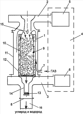 Для сбора выходных продуктов к трубе 16 подключены сборник углерода, блок отбора водородосодержащей газовой смеси и трубопровод для экстренного сброса продуктов в атмосферу.
