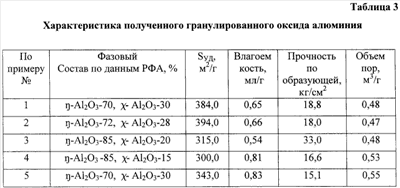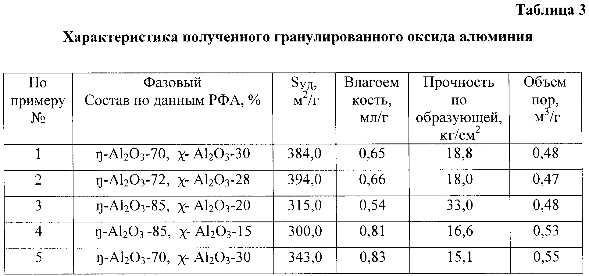 Изобретения относятся к области химии. Гранулированный активный оксид алюминия представляет собой по фазовому составу эта- и/или гамма-форму, характеризуется прочностью на раздавливание по образующей 16-85 кг/см2, удельной поверхностью 180-395 м2/г, суммарным объемом пор 0,37-0,56 м3/г, влагоемкостью 0,38-0,83 мл/г и одновременным присутствием на поверхности ОН-центров с полосой поглощения 3775 см-1 и сильных Льюисовских кислотных центров с полосами поглощения выше 2215 см-1. Гидроксид алюминия псевдобемитной или байеритной структуры, получаемый терморазложением гидраргиллита под действием центробежных сил при тонкослойном распределении гидраргиллита на вращающейся и нагретой до температуры 330-600°С поверхности и времени контакта 0.1-2.0 с с получением псевдоаморфной структуры продукта терморазложения гидраргиллита, подвергают гидратации водными растворами кислот или щелочей при рН=5-11, соотношении жидкость к твердому, равном 1-10:1, температуре 10-80°С при постоянном перемешивании в течение 24-168 ч, или смесь гидроксида и оксида алюминия гамма- или эта-формы, полученного из этих гидроксидов, пластифицируют, сушат и подвергают термической обработке. Изобретения позволяют увеличить пористость, удельную поверхность, прочность на раздавливание получаемого оксида алюминия. 2 н. и 3 з.п. ф-лы, 4 табл.