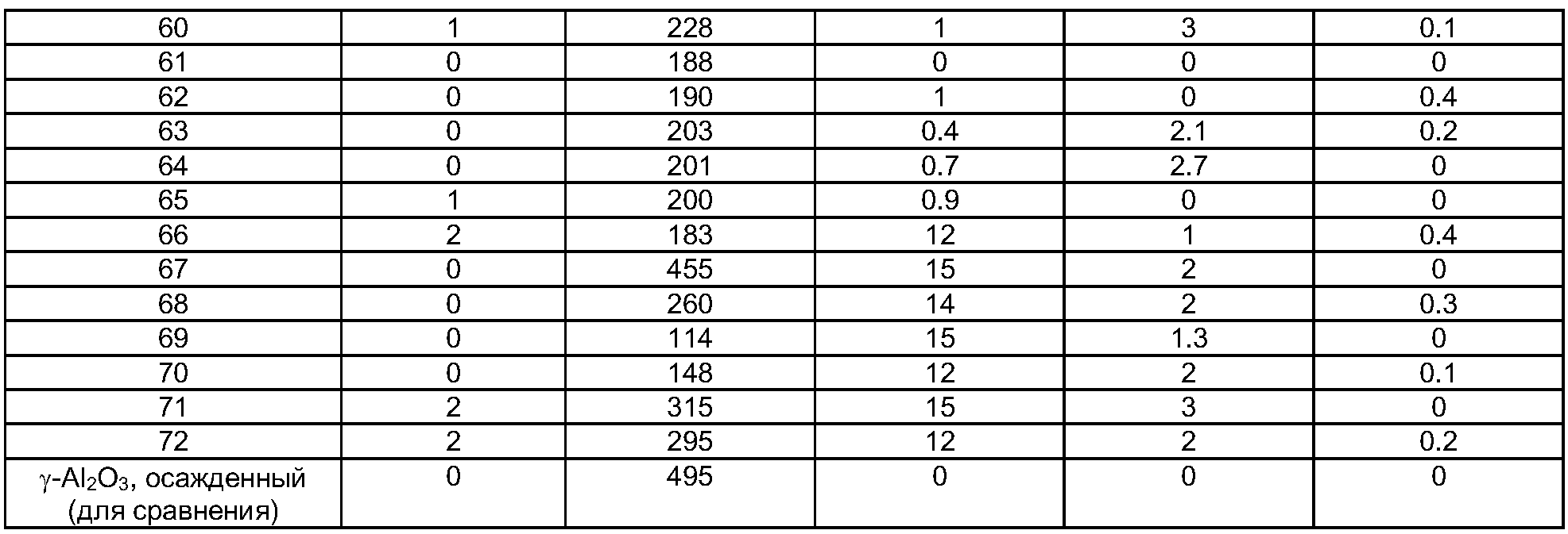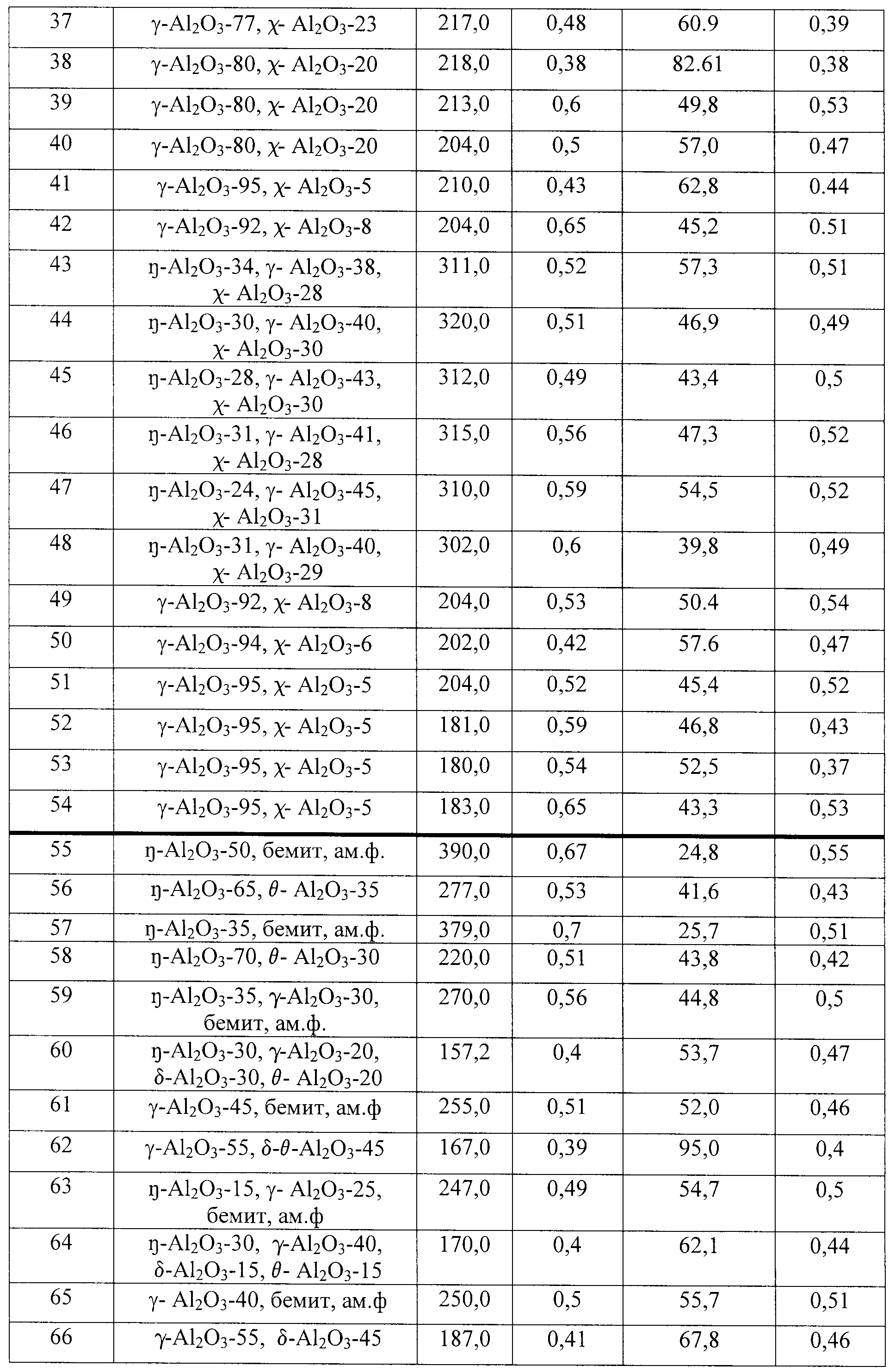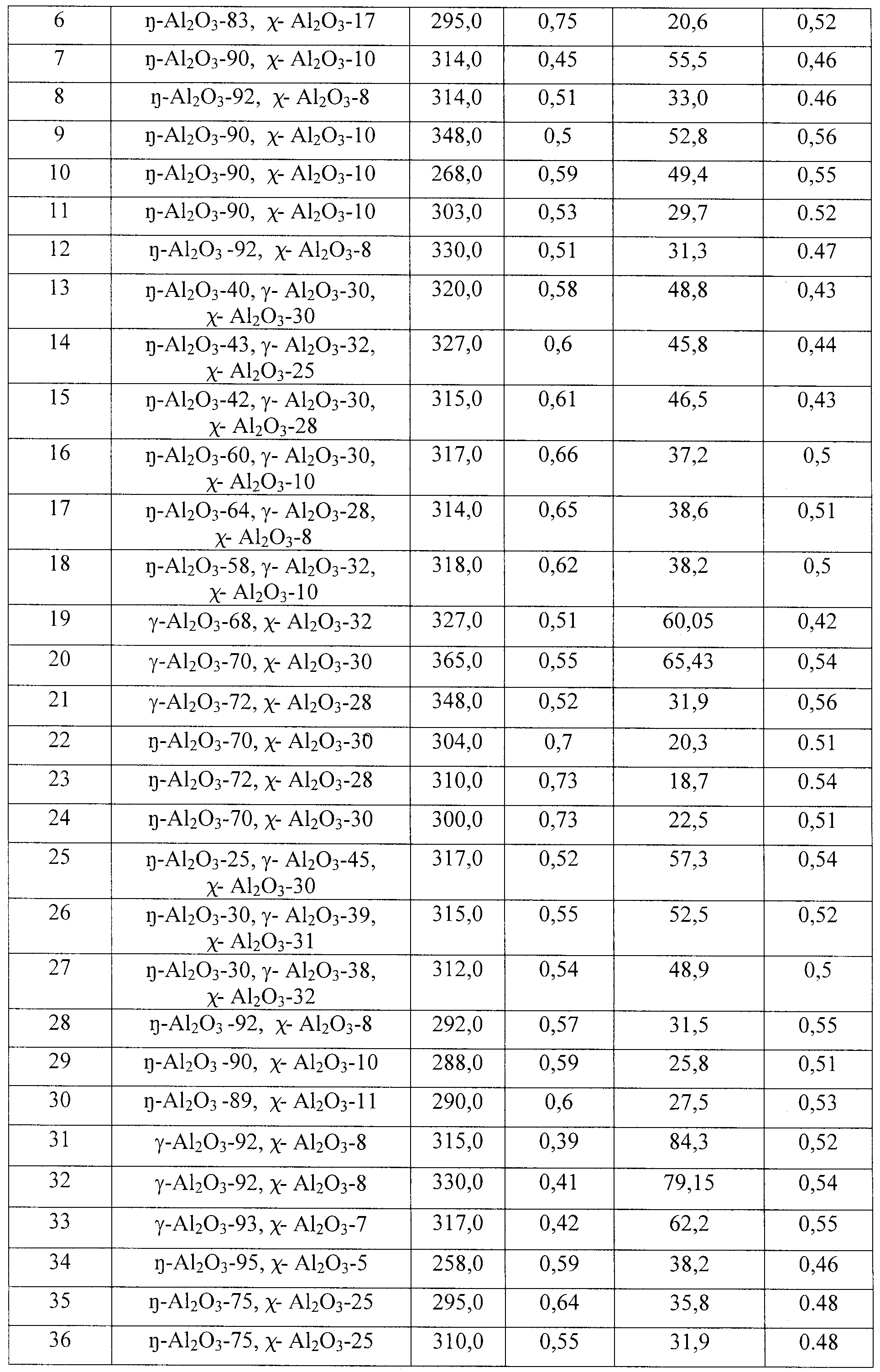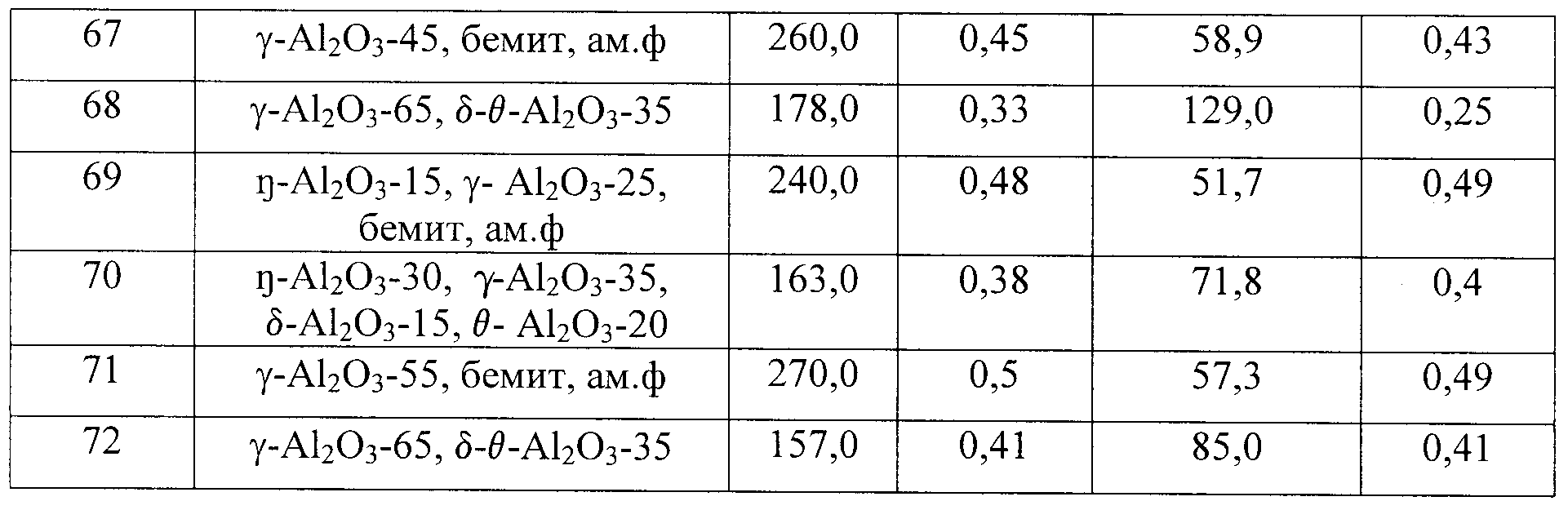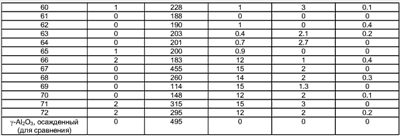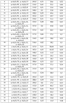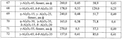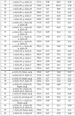 -Аl2О3 в оксиде 60 мас.% при среднем размере первичных кристаллитов 40 Å и удельной поверхности 226 м2/г. Содержание