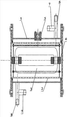 На чертеже представлен общий вид установки. Установка для обеззараживания воды ультрафиолетовым излучением содержит внешний цилиндрический корпус из нержавеющей стали 1, внутренний кварцевый цилиндрический кожух 2, предохраняющий лампу от попадания воды, кварцевую тороидальную газоразрядную колбу 3, ферритовые сердечники 4, «окно» для контроля интенсивности ультрафиолетового излучения 5, трубку для подвода обеззараживаемой воды 6, трубки для промывки системы 7, трубку для вывода обеззараживаемой воды 8.