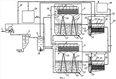 Сточные воды по трубопроводу 1 подают в устройство 2 тонкой механической очистки с прозорами 2-4 мм, где происходит задержание грубодисперсных взвесей. Затем сточные воды поступают в вертикальную песколовку 3, где осуществляется осаждение песка. Далее сточные воды поступают в камеру смешения 4, а затем в устройства комбинированной биологической очистки 5. В камеру смешения 4 под гидростатическим давлением поступает по самотечным трубопроводам 16 ил из аэрационных зон 12. В случае, если в описываемой установке биохимической очистки сточных вод применено от двух до четырех устройств комбинированной биологической очистки, то ее выполняют с одним циркуляционным насосом 18. Это условие исходит из конструктивных соображений строительства очистных сооружений, управления гидродинамическими потоками жидкости в биофильтрах и аэротенках-отстойниках, а также временного отключения отдельных элементов. При большем количестве устройств комбинированной биологической очистки, имея один циркуляционный насос 18, крайне сложно регулировать гидродинамический режим работы биофильтров и аэротенков-отстойников. Полупроизводственные исследования показали, что при количестве устройств комбинированной биологической очистки от четырех до шести целесообразно выполнять камеру смешения блока очистных сооружений с двумя одновременно работающими насосами и разделять их перегородками с щитовыми затворами.