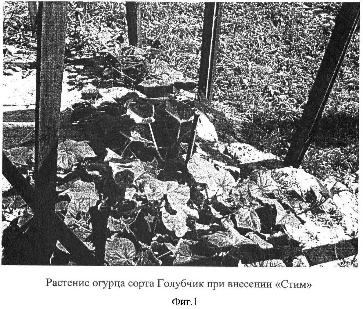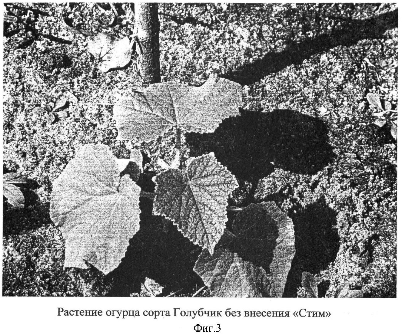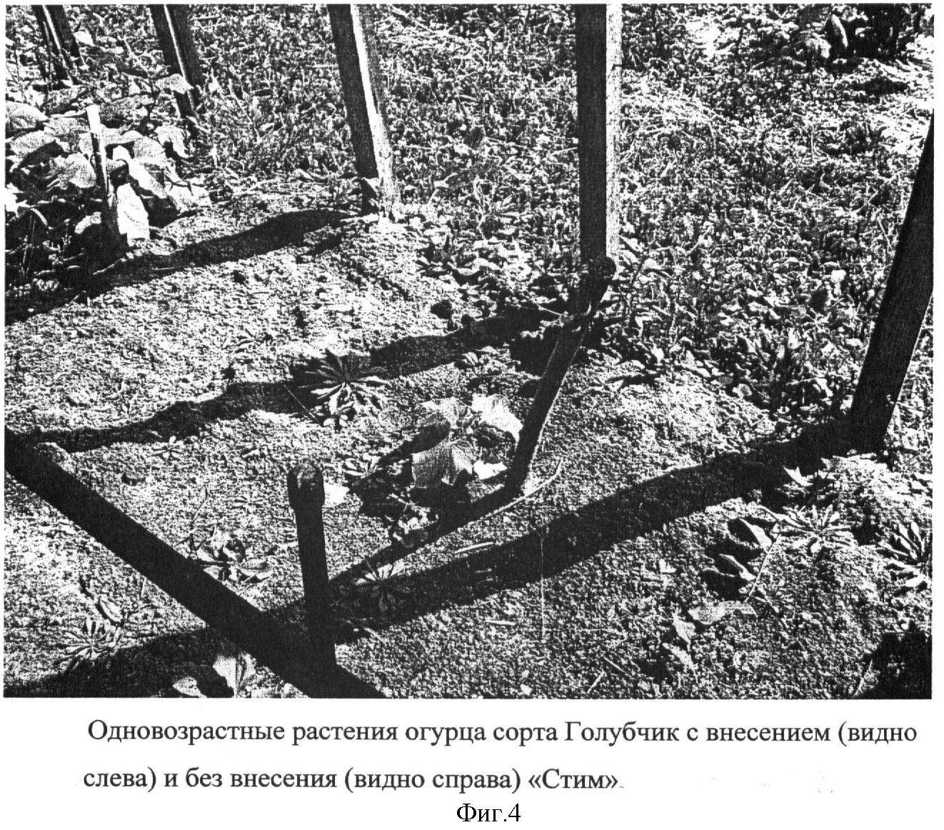 Опыты по влиянию препарата на рост и развитие растений огурца на песке также подтвердили стимулирующее действие препарата (фиг.1-4). Без внесения в песок суспензии растения огурца развивались плохо, не цвели и не плодоносили (фиг.3). Двукратное внесение в почву суспензии дало возможность, требовательной к азоту культуре, активно расти и даже плодоносить (фиг.2).