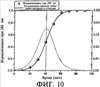 Фиг.10: Пример распределения времени пребывания материала в установке и среднего времени пребывания материала в установке интегрированной системы (300) непрерывной ультрафильтрации, например, для способа применения предлагаемого настоящим изобретением устройства А. Определялись для одноразовой непрерывной системы с модулем 290 см2 (длиной 62,5 см), перекрестным потоком 120 LMH, потоком осадка 0,2 LMH, потоком растворенного вещества 2 LMH.
