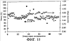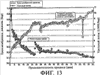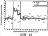Фиг.13: Пример долгосрочных рабочих характеристик предлагаемого настоящим изобретением устройства А, непосредственно применяемого в непрерывном процессе перфузионной ферментации линии клеток, коэкспрессирующей 2 белковых продукта (зеленый флуоресцентный белок GFP и IL-2SA (интерлейкин 2SA)). Показано трансмембранное давление и удельный поток предлагаемой настоящим изобретением системы (300) непрерывной ультрафильтрации как функция продолжительности непрерывного процесса. Применялась 10 кДа мембрана.