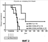 Как показано на фиг.1, средняя выживаемость мышей NOD/SCID, инъецированных только клетками KMS-11, составила 56 дней. Инъекция клеток CD34+ дикого типа не влияла на среднюю выживаемость (56 дней), тогда как мыши NOD/SCID, которых лечили клетками Ad-TRAIL/CD34+ на ранней стадии опухоли, имели среднюю выживаемость в 111 дней (P <0,0001).