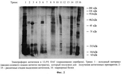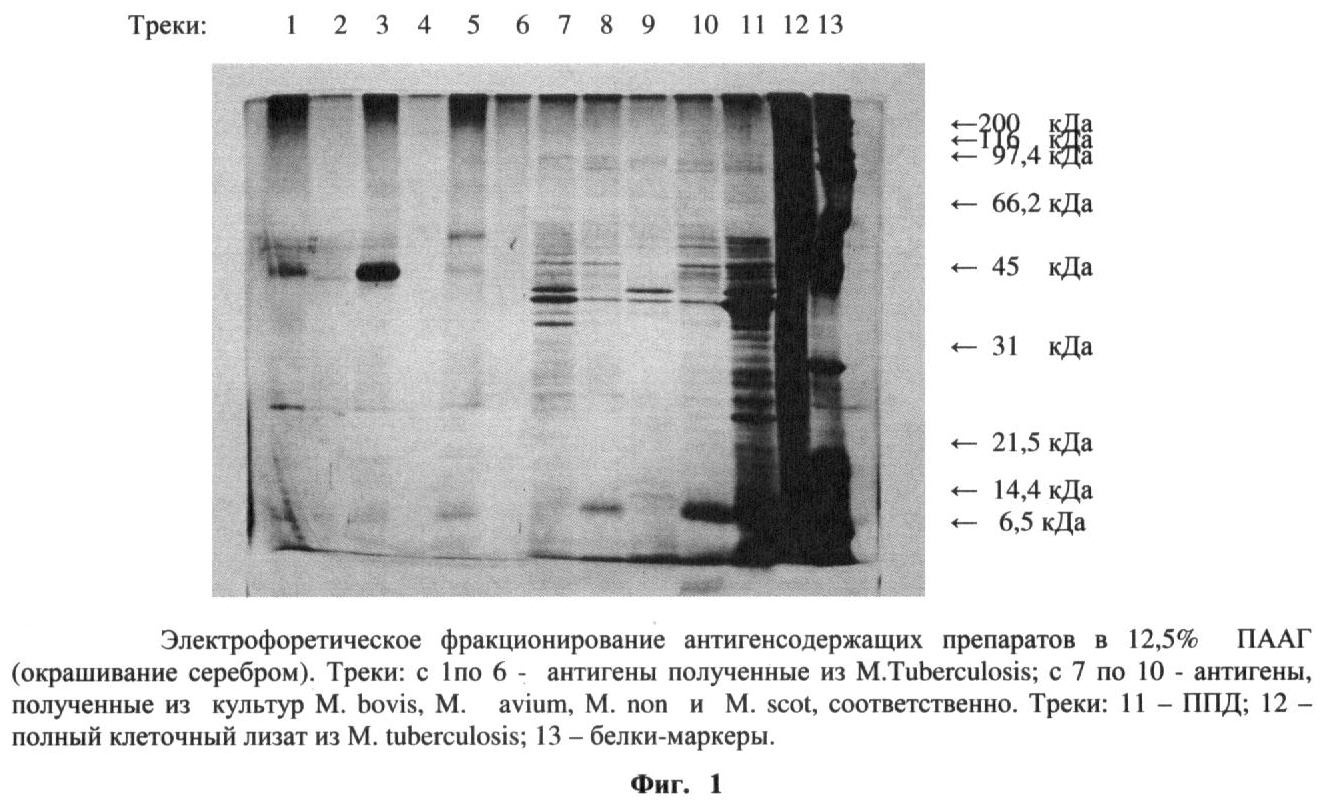 Пример 2. Полипептидный состав антигенов, полученный из нативных клеток Micobacterium tuberculosis в сравнении с близкородственными антигенами, полученными из Micobacterium bovis, Micobacterium avium, Micobacterium non, Micobacterium scot, изучали при помощи вертикального диск-электрофореза в 12,5% полиакриламидном геле (ПААГ) [10]. После электрофореза пластины фиксировали в 40%-ном спиртовом растворе, содержащем 10% уксусной кислоты, отмывали в дистиллированной воде и окрашивали кумасси ярко-синим G-250, с последующим окрашиванием раствором азотнокислого серебра, фиг.1, 2.