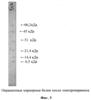 Пример 3. Электроперенос антигенных препаратов, фракционированных в ПААГ на нитроцеллюлозную мембрану 0,45 мкм проводили по методу [11] при силе тока 200 мА в течение 180-200 минут в полусухой системе с использованием угольных электродов с охлаждением до +4 – +8°С. Маркерные белки после электропереноса окрашивали красителем Понсо С (0,04% Понсо С в 12,5% трихлоруксусной кислоте) фиг.3. Мембрану с нанесенным антигенным материалом выдержи 20 мин в блок-растворе, содержащем 1% сухое обезжиренное молоко на фосфатно-солевом буферном растворе (ФБР) рН 7,2-7,4; промывали 3 раза дистиллированной водой и высушивали.