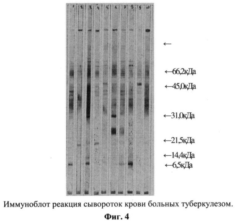 Результаты реакции оценивали визуально и инструментально в отраженном свете на сканере Sharp Jx-330 с использованием программы Image Master 10 Prime, версия 3,00 (Pharmacia Biotech). Интенсивность окрашенных полос (количественный анализ сканированных фракций) выражалась в оптических единицах плотности (Pixel). Полученные результаты обрабатывали с использованием программы Microsoft Excel и представляли в виде табличных данных и линейных графических изображений. Пример иммуноблот анализа сывороток крови больных туберкулезом представлен на фиг.4. Полученные результаты свидетельствуют о наличии серологической активности зон с молекулярной массой 80-90 кДа (в 60% случаев), 60-65 кДа (в 100% случаев), 30-40 кДа (в 100% случаев), 10-25 кДа (в 100% случаев). Данный факт свидетельствует о серологической значимости полипептидов обозначенных молекулярных масс, которые являются стимуляторами антителогенеза В-зависимой клеточной системы.