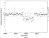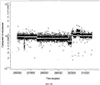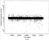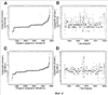 На фиг.6А (объединенные данные из наборов данных 10К и 85К) показано, что алгоритм мягкой фильтрации (если отношение имело наибольшее отклонение из четырех соседних, его заменяли отношением, наиболее близким отношением из двух соседних) может минимизировать влияние точечной вариации последовательности и визуализировать случаи, где существует реальная вариация числа копий. Облако рассеянных полиморфизмов, присутствующее в образце, не подвергнутом фильтрации (например, фиг.С2), увеличивается при таком представлении данных, выявляя неслучайные кластеры отклоняющихся отношений зондов, включая крупномасштабные геномные различия между нормальными индивидами.