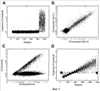 На фиг.2А1-2А3, 2В1-2В3 и 2С1-2С3 показаны геномные профили для образца первичного рака молочной железы (CHTN159), с анеуплоидными ядрами, в сравнении с диплоидными ядрами от того же пациента (фиг.2А1-2А3), линии клеток рака молочной железы, в сравнении с эталоном нормальной мужской особи (фиг. 2В1-2В3), и нормальной мужской особи с эталоном нормальной мужской особи (фиг. 2С1-2С3), с использованием печатной матрицы 10К (фиг.2А1, 2В1 и 2С1) и с использованием фотопечатной матрицы 85К (фиг.2А2, 2В2 и 2С2). В каждом случае (фиг.2А1, 2В1 и 2С1 и фиг.2А2, 2В2 и 2С2) ось Y представляет собой среднее отношение, а ось Х (Ген-индекс) представляет собой индекс, который графически представляет расположение зондов в том геномном порядке, в котором они представлены в хромосомах, и дает возможность визуализировать весь геном от хромосомы 1 до Y. На фиг.2А3, 2В3 и 2С3 показано соответствие отношений, измеренных для зондов-«братьев», представленных в микроматрицах 10К и 85К. Ось Y представляет собой измеренное отношение для микроматрицы 10К, а ось Х представляет собой измеренное отношение для микроматрицы 85К.