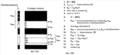 Эта процедура повторяется несколько раз, прибавляя одну «букву» в суффиксе за один раз, останавливаясь, если данный суффикс отсутствует в словаре генома. Если суффикс W охватывает все «слово», Z, kw равно количеству Z в строке генома. Эта процедура описана в виде псевдокода, как показано на фиг.12В. В соответствии с фиг.12В Z представляет собой строку длины N, составленную из «букв» из алфавита генома, и структура данных «букв-границ» содержит индексы первого и последнего появлений в словаре генома для каждой «буквы» в алфавите генома.
