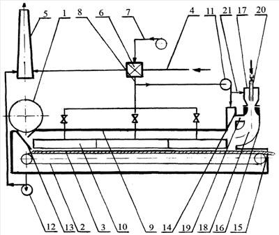 Способ термообработки окатышей реализуется с помощью устройства, показанного на чертеже. Устройство содержит окомкователь 1, на котором происходит окомкование шихты с получением влажных окатышей. Для транспортирования окатышей к обжиговой машине (на фигуре машина не показана) предназначена транспортерная лента 2. Влажные окатыши укладываются на ленту слоем 3. Для удаления отработанных горновых газов от обжиговой машины предназначен дымоход 4 и дымовая труба 5. В дымоходе установлен рекуперативный теплообменник 6. Он содержит воздуховод 7 холодного воздуха и воздуховод 8 горячего воздуха. Устройство снабжено теплоизолирующим горном 9. Транспортерная лента с окатышами расположена в рабочем пространстве теплоизолирующего горна. Над слоем сырых окатышей установлен дутьевой воздухораспределительный короб 10, состоящий из нескольких секций. Нижняя часть дутьевого короба, ориентированная на слой окатышей, снабжена соплами. Для нагнетания горячего воздуха в горн предназначен вентилятор 11, расположенный на выходе горна. Для отсасывания отработанных газов из рабочего пространства горна служит дымосос 12, расположенный на входе горна. На своде горна выполнен загрузочный узел 13, необходимый для загрузки сырых окатышей на транспортерную ленту. Горн снабжен торцевой стенкой 14. Для выдачи окатышей с транспортерной ленты на роликовый укладчик в торцевой стенке горна выполнено разгрузочное окно 15. Устройство дополнительно содержит форкамеру 16, снабженную топливосжигающим устройством 17, туннелем 18 и воздушными каналами 19 (на схеме показан один канал). Топливосжигающее устройство (горелка или форсунка) снабжено трубой 20 для подачи топлива и каналом 21 для подачи воздуха горения.