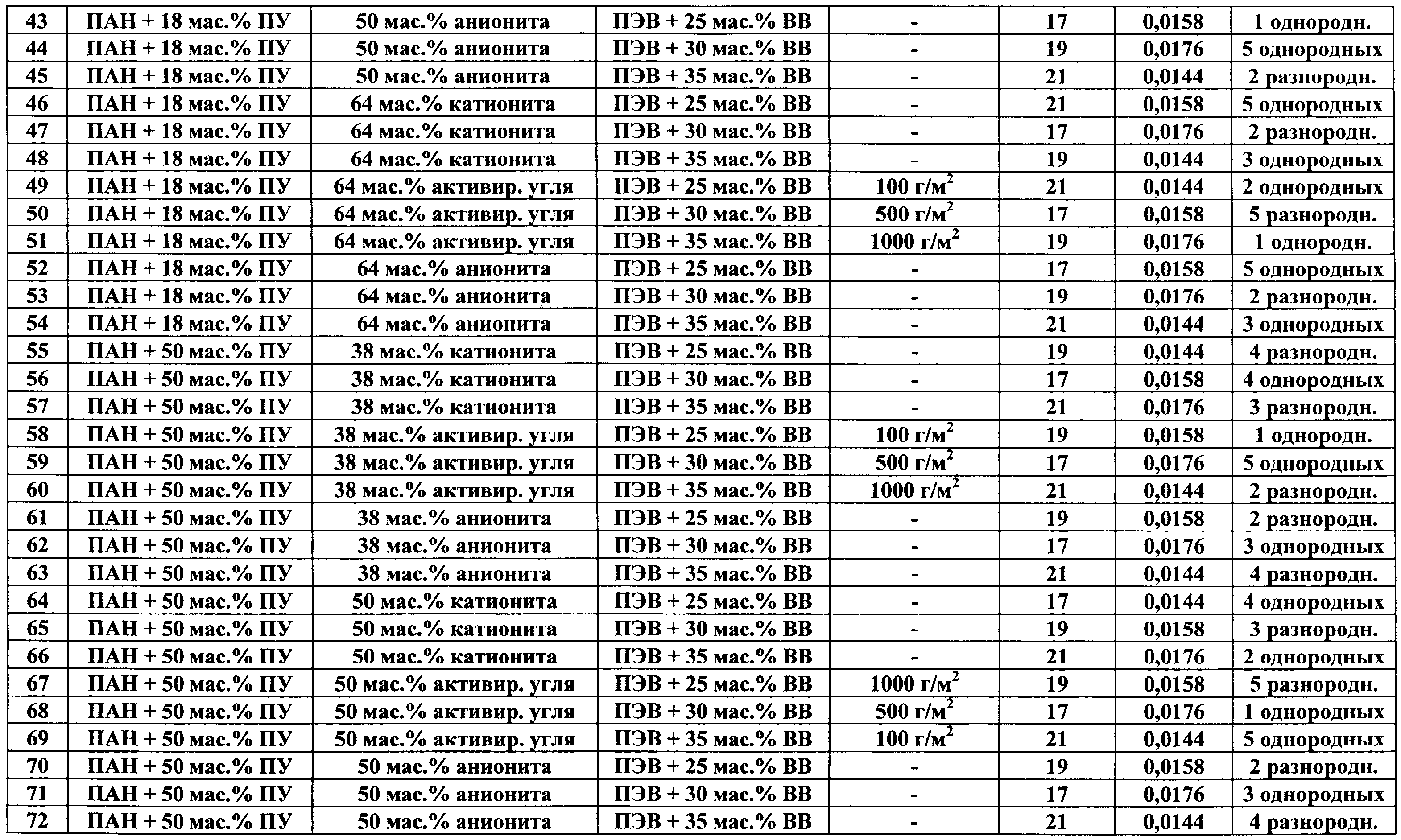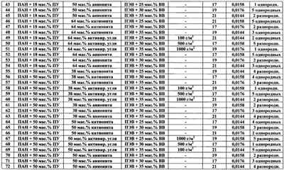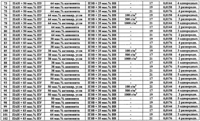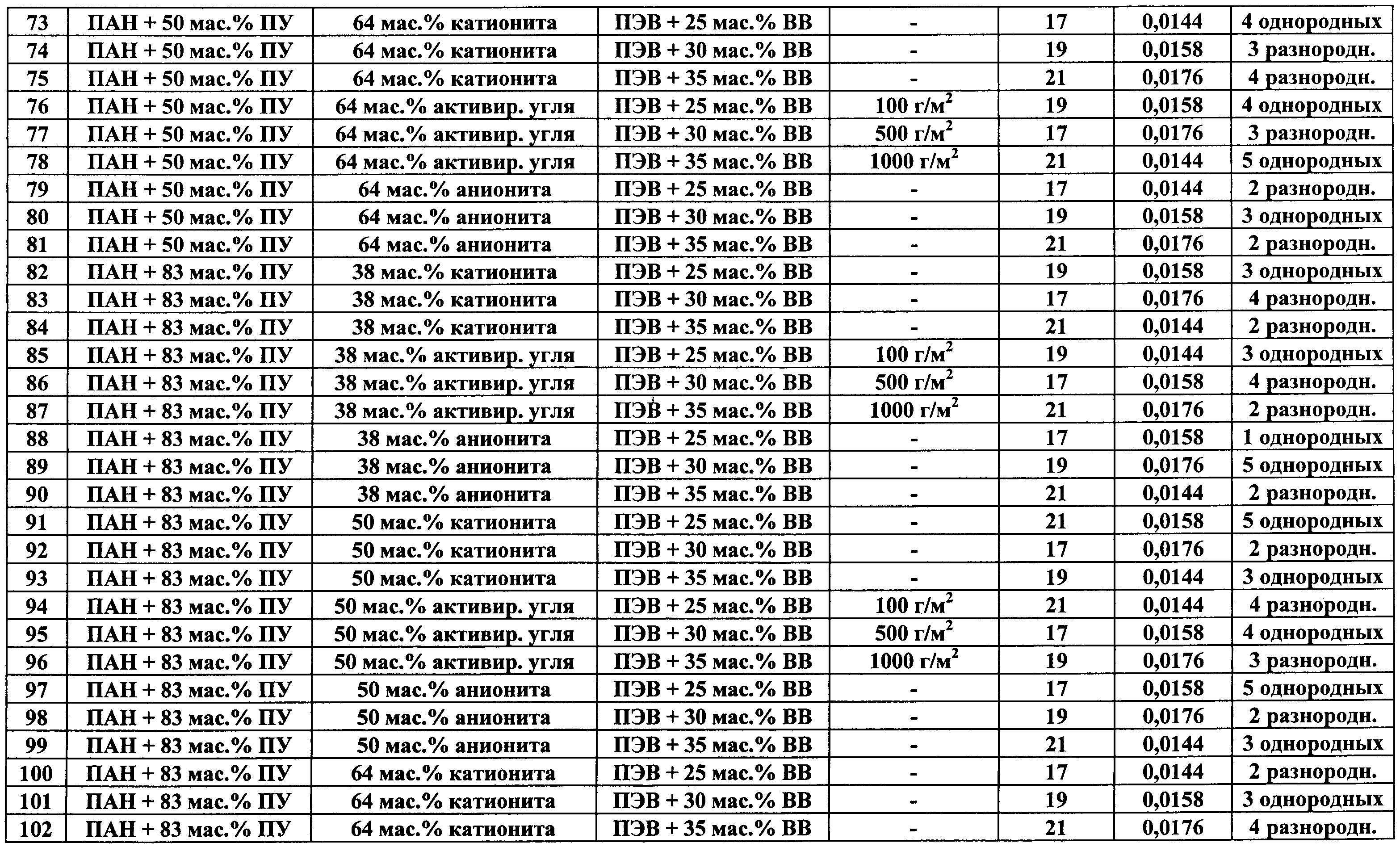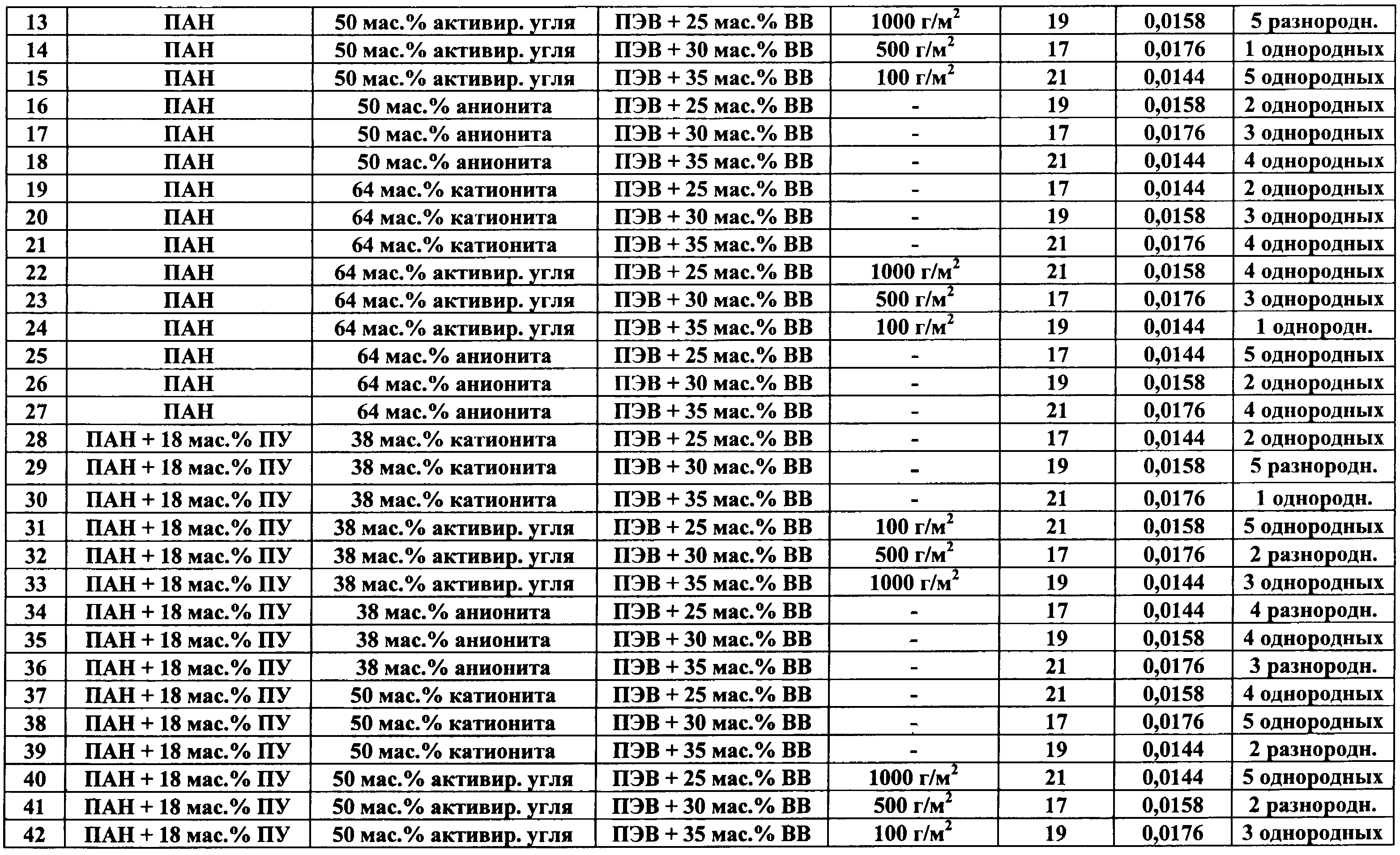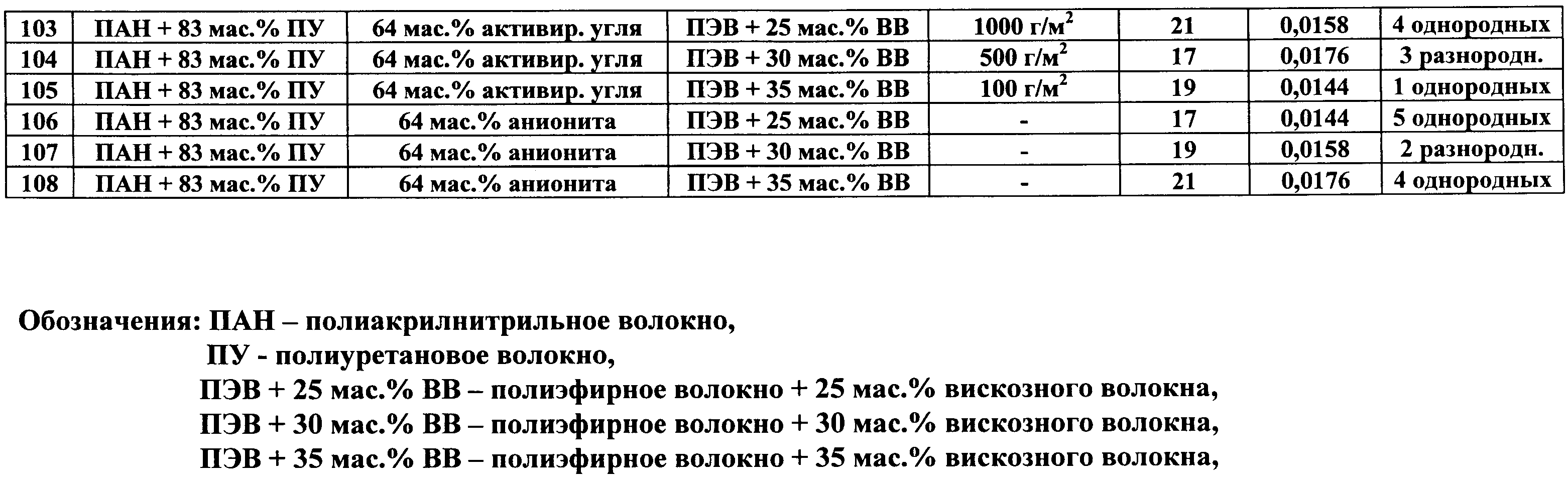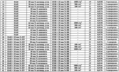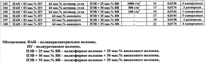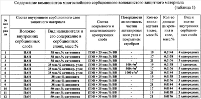 Изобретение относится к области производства нетканых материалов, а именно к многослойным сорбционным волокнистым защитным материалам, и может быть использовано при изготовлении защитной одежды, предохраняющей от повреждения кожный покров человека. Известен многослойный сорбционный нетканый материал, состоящий из внутренних слоев нетканого материала из наполненных твердыми сорбционными частицами волокон на основе полиакрилнитрила или его смеси с полиуретаном и наружного покровного и наружного подстилающего армирующих слоев, расположенных с двух сторон сорбционных слоев нетканого материала (см. патент РФ Однако известный многослойный сорбционный нетканый материал при своем использовании для изготовления защитной одежды обладает следующими недостатками: – не обеспечивает необходимый уровень прочности материала на разрыв (780 Н по основе и 310 по утку), – обладает недостаточной паровоздухопроницаемостью при отводе избытка влаги от поверхности кожного покрова человека (количество водяного пара, проходящего через единицу площади материала в единицу времени при заданной температуре 36°С составляет 56-58 г/м2.час). Задачей изобретения является создание многослойного сорбционного волокнистого защитного материала. Техническим результатом является обеспечение высокой паровоздухопроницаемости материала для отвода избытка влаги от поверхности кожного покрова человека, повышение его гигроскопичности, создание возможности обеспечения высокой драпируемости материала при одновременном получении материала с высокой прочностью на разрыв и с высокой прочностью на раздирание. Технический результат достигается в предложенном многослойном сорбционном волокнистом защитном материале сочетанием использованных для его изготовления компонентов, а также их количественными соотношениями. Технический результат достигается тем, что предложен многослойный сорбционный волокнистый защитный материал, состоящий из внутренних слоев нетканого материала из наполненных твердыми сорбционными частицами волокон на основе полиакрилонитрила или его смеси с полиуретаном и наружного покровного и наружного подстилающего тканых армирующих слоев, расположенных с двух сторон сорбционных слоев нетканого материала, при этом материал содержит 1-5 однородных или разнородных внутренних сорбционных слоев из нетканого высокопористого материала, при использовании в качестве волокон нетканого материала внутренних слоев смеси волокон полиакрилонитрила и полиуретана, содержание волокон полиакрилонитрила в смеси с полиуретаном выбрано в количестве 18-83 мас.%, в качестве наполнителя сорбционных слоев из нетканого материала используют твердые частицы активированного угля, катионита или анионита с размерами частиц менее 6 мкм, размещенные в объеме нетканого материала в количестве 38-64 мас.%, сорбционные слои материала армированы приклеиванием наружным покровным слоем и вторым наружным подстилающим слоем, выполненными из вискозно-лавсанового основовязаного материала на основе высокопрочного полиэфирного волокна, содержащего 25-35 мас.% вискозного волокна, при этом для приклеивания используют клеевую порошковую композицию на основе сополимера этилена, содержащую на 100 массовых частей сополимера этилена 17-21% винилацетата и 0,0144-0,0176 массо