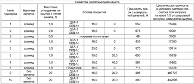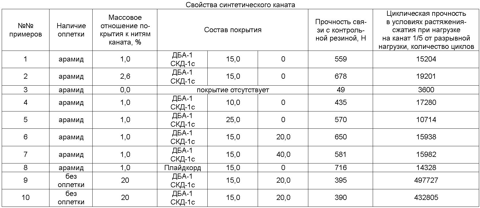 Изобретение относится к области производства синтетического каната, в состав которого входят арамидные волокна, и может быть использовано в резинотехнической промышленности, в частности для производства высокопрочных резинокордных оболочек. Известен синтетический трос (а.с. СССР Недостатками известного троса являются нестойкость к тепловому воздействию и низкая устойчивость к многократным деформациям. Наиболее близким по совокупности технических признаков и достигаемому техническому результату – прототипом, является синтетический трос (патент RU Недостатками известного синтетического троса являются низкая устойчивость к многократным деформациям и низкая прочность связи с резиной, разная степень усадки оплетки и сердечника, не позволяющие использовать данный трос при изготовлении высокопрочных резинокордных оболочек. Техническим результатом предлагаемого изобретения является устранение указанных недостатков и получение синтетического каната, имеющего высокую прочность связи с резиной, устойчивого к многократным деформациям и тепловому воздействию. Предлагаемый синтетический канат состоит из сердечника на основе арамидных волокон и необязательно из оплетки из синтетических нитей, покрыт латекснорезорцинформальдегидным составом при следующем соотношении компонентов: 100 мас.ч. латекса; 10-25 мас.ч. резорцинформальдегидной смолы; 20-40 мас.ч. технического углерода. Массовое отношение покрытия к нитям синтетического каната составляет 1,0-20,0%. Сердечник каната без оплетки выполнен из комплексных арамидных нитей линейной плотности 58,8 текс или 100 текс. Латекснорезорцинформальдегидный состав изготавливается по известным технологическим схемам. Совокупность существенных признаков по предлагаемому изобретению позволяет получить синтетический канат, выдерживающий многократные деформации, высокие температуры, обеспечивающий высокую прочность связи с резиной, что позволяет использовать его в качестве силового элемента высокопрочных резинокордных оболочек. Сущность предлагаемого синтетического каната поясняется следующими примерами. Пример 1. Синтетический канат, например, марки КС-4 диаметром 4 мм по ТУ 8121-008-51605609-2000, содержит в составе сердечника арамидный жгут с разрывной нагрузкой 980Н, а в составе оплетки арамидную нить, покрыт составом, содержащим латексы ДБА-1-сополимер бутадиена, бутилакрилата и метакриламида, СКД-1c – бутадиенкарбоксилсодержащий сополимер и 5%-ный раствор новолачной резорцинформальдегидной смолы СФ-282. Соотношение компонентов в составе: 100 мас.ч. латекса; 15 мас.ч. резорцинформальдегидной смолы. Массовое отношение покрытия к нитям синтетического каната – 1%. Пример 2. Отличается от примера 1 тем, что массовое отношение покрытия к нитям синтетического каната – 2,6%. Пример 3. Отличается от примера 1 тем, что синтетический канат не содержит покрытия. Пример 4. Отличается от примера 1 тем, что соотношение компонентов в составе покрытия составляет: 100 мас.ч. латекса; 10 мас.ч. резорцинформальдегидной смолы. Пример 5. Отличается от примера 1 тем, что соотношение компонентов в составе покрытия составляет: 100 мас.ч. латекса; 25 мас.ч. резорцинформальдегидной смолы. Пример 6. Отличается от примера 1 тем, что синтетический канат покрыт составом, который дополнительно содержит дисперсию технического угле
