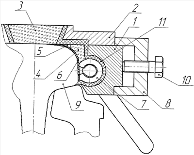 Предлагаемое устройство для соединения пайкой рельсовых стыков с соединителем содержит корпус 1 с реакционной полостью 4, крышку 2 с реакционной полостью 3, с заложенными в них термитными смесями, термитная смесь в полости 4 выполнена в виде цельного уплотненного заряда, содержащего в верхней части легко воспламеняемый переходной заряд 5 и запал в виде тонкого нихромового проводника, обмазанного легко воспламеняемым составом (не показан), находящегося в контакте с термитной смесью в полости 3 крышки 2 и термитной смесью 6 в корпусе 1, в цилиндрической полости корпуса плотно охвачена и закреплена манжета рельсового соединителя 7, корпус прижат к рельсу в месте пайки с помощью держателя 8, закрепленного на головке рельса 9 неподвижно, например, с помощью магнитов, и зафиксирован на держателе с помощью винтов 10, полость, выполненная в крышке, расположена над поверхностью головки рельса над местом пайки, все реактивные полости выложены термостойким картоном 11. Аналогичное устройство устанавливается на головку второго стыкуемого рельса