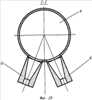 При работе ямно-траншейным способом грунтозаборное устройство не только опускается вниз, но и перемещается вперед (вправо на фиг.8). Вытекающими из сопел 6 и 7 струями воды грунт взрыхляется: отделенный от ложа дна грунт перемешивается с водой, вытекающей из сопел 6, с образованием зоны высоконасыщенной водогрунтовой смеси. При перемещении вперед грунтозаборного устройства вслед за соплами 6, установленными впереди сопел 5 по ходу движения монитора (фиг.8-19), в зону взрыхленного грунта поступают сопла 5. Струи воды, вытекающие из сопел 5, подхватывают размытый соплами 6 и 7 грунт и перемещают его к всасывающему зеву. При этом вода из сопел 6 воздействует на грунт под прямым углом, что обеспечивает высокую эффективность рыхления слежавшихся плотных грунтов, а сопла 5 только транспортируют грунт. Следовательно, благодаря установке сопел 6 впереди сопел 5 по ходу движения монитора обеспечивается эффективная работа ямно-траншейным способом при разработке плотных слежавшихся грунтов.