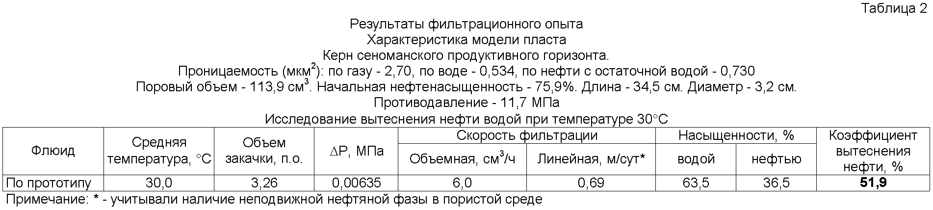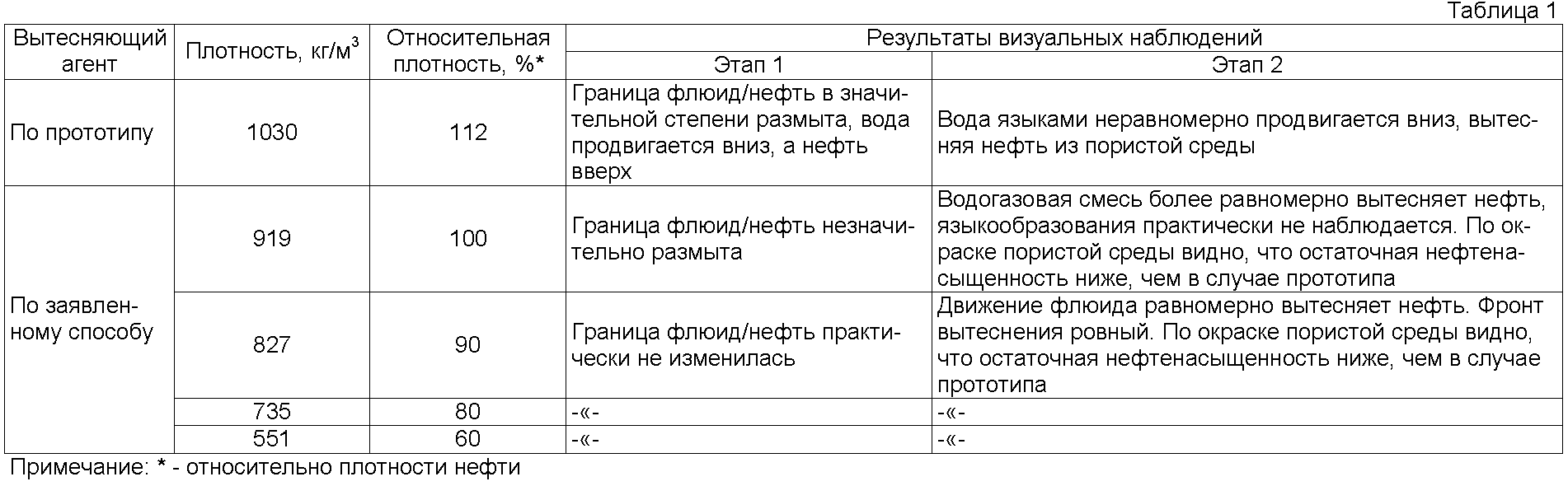 Пример 2. Вытесняющий агент, используемый для разделения газовой шапки и нефтяной оторочки при барьерном заводнении, должен эффективно вытеснять нефть. Исследование нефтевытесняющей способности по прототипу и по заявляемому способу проводили по следующей методике. Корпуса моделей пласта набивали сеноманским керном, насыщали под вакуумом минерализованной водой плотностью 1030 кг/м3 (модель воды сеноманского горизонта). Затем через модель пласта фильтровали минерализованную воду для определения проницаемости пористых сред по воде. Насыщение изовискозной моделью нефти проводили в процессе фильтрации. Для этого изовискозную модель нефти подавали сверху в вертикально расположенную модель пласта, а на выходе измеряли объемы воды и нефти. В процессе насыщения через модель фильтровали не менее 4 п.о. нефти. В конце насыщения измеряли проницаемость модели по нефти с остаточной водой. Начальную насыщенность определяли методом материального баланса.