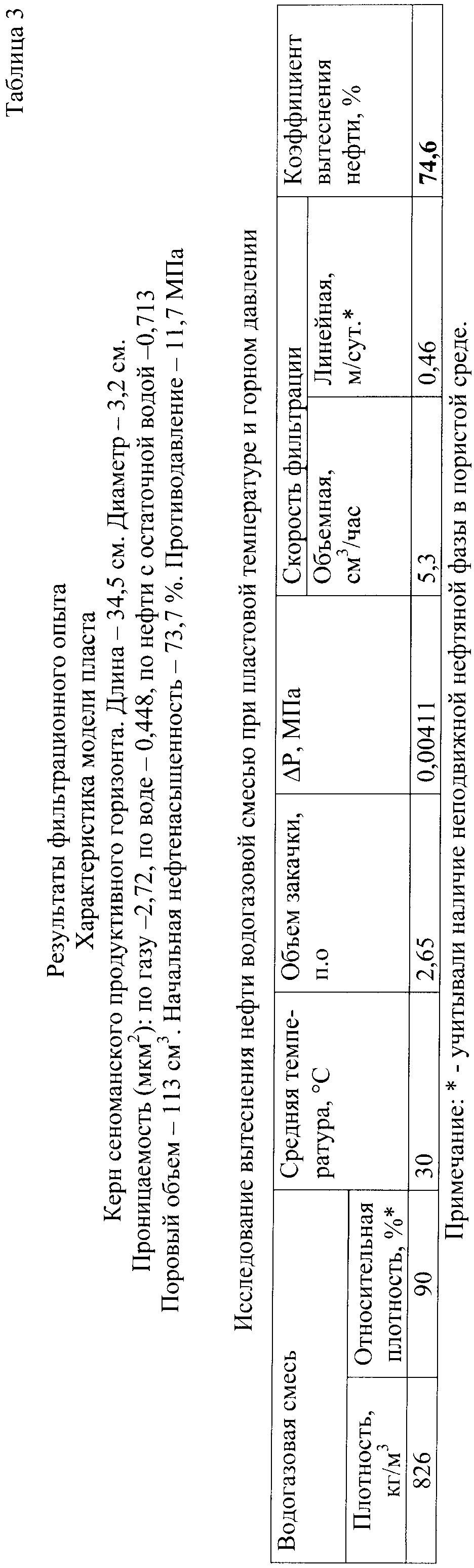 Сопоставление данных табл.2 и 3 показывает, что нефтевытесняющая способность заявленной водогазовой смеси намного выше, чем по прототипу. Остаточная нефтенасыщенность в случае использования в качестве вытесняющего агента по прототипу составляет 36,5%, а при использовании в качестве вытесняющего агента заявленной водогазовой смеси составляет 18,7%, т.е. почти в 2 раза меньше.