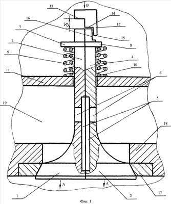 На чертежах фиг.1 показан общий вид с разрезами одного из клапанов газораспределительного механизма в момент режима сжатия двигателя внутреннего сгорания, а на фиг.2 – положение части клапана в начальный момент режима выхлопа.