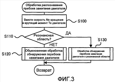 32. Способ распознавания перебоев зажигания двигателя для распознавания перебоя зажигания двигателя в многоцилиндровом двигателе внутреннего сгорания, в котором выходной вал присоединен к задней части через торсионный элемент, при этом согласно способу вычисляют угловую скорость на единичных углах поворота, которая является угловой скоростью для каждого предписанного единичного угла поворота выходного вала двигателя внутреннего сгорания, на основе положения поворота выходного вала двигателя внутреннего сгорания, производят распознавание в отношении того, подвергается или нет какой бы то ни был из цилиндров двигателя внутреннего сгорания перебою зажигания двигателя, используя первую методику для вычисленной угловой скорости на единичных углах поворота, когда приводная точка двигателя внутреннего сгорания не принадлежит резонансной области задней части, включающей в себя торсионный элемент, и производят распознавание в отношении того, подвергается или нет какой бы то ни был из цилиндров двигателя внутреннего сгорания перебою зажигания, используя вторую методику, которая отлична от первой методики, для вычисленной угловой скорости на единичных углах поворота, когда приводная точка двигателя внутреннего сгорания принадлежит резонансной области.