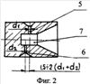 Горючее в этот же момент по подводящему каналу 3 поступает в смесительный элемент 4 и через струйную форсунку 6 в полость отверстия 7. За счет удара о противоположную стенку горючее распыливается на мелкие капли в виде тумана и частично испаряется. Часть горючего растекается по поверхности отверстия 7 в виде пелены. Повышению качества перемешивания компонентов топлива способствует пронизывание пелен окислителя и горючего струями горючего и окислителя соответственно. Капли окислителя и горючего сталкиваются друг с другом в полости отверстия 7 и вступают в химическую реакцию в жидкой фазе. Пелены окислителя и горючего, растекающиеся по поверхности отверстия 7, также вступают в химическую реакцию в жидкой фазе. Происходит выделение жидкофазных промежуточных продуктов, при взаимодействии которых с парами окислителя и горючего выделяются газофазные промежуточные продукты горения, при этом резко повышается температура продуктов сгорания. Время, необходимое для выделения газофазных промежуточных продуктов, для топлива AT+НДМГ составляет ~ 0,5·10-4 с, поэтому для предотвращения перегрева конструкции форсуночной головки необходимо ограничить объем и длину полости глухого отверстия 7 смесительного элемента и тем самым перевести процессы горения в камеру сгорания (не показана). С этой целью выбирается диапазон расстояний между осями форсунок в пределах 1,5-2,0 суммы диаметров форсунок горючего и окислителя, что исключает пересечение струй и одновременно обеспечивает плотный контакт компонентов топлива в жидкой фазе, промежуточных жидкофазных продуктов и газофазных промежуточных продуктов в объеме полости глухого отверстия 7. При такой организации рабочего процесса достижение D 0,8 не составляет проблем для двигателей с уровнем тяги менее 1 Н.