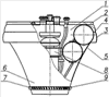 Компоненты топлива подаются в смесительную головку 2, воспламеняются и истекают через кольцевое критическое сечение 4. В тарельчатом сопле внешнего расширения продукты сгорания расширяются, причем внешняя граница расширения определяется атмосферным давлением, а внутренняя – контуром профилированного центрального тела. Продукты сгорания со сверхзвуковой скоростью поступают к срезу тарельчатого сопла 3 и обтекают при этом лопатки 9, установленные на подвижной части 7 центрального тела 5. Подвижная часть 7 центрального тела начинает вращаться вокруг оси центрального тела и приводит во вращение насосы подачи компонентов топлива турбонасосного агрегата 8, которые подают компоненты топлива в смесительную головку 2.