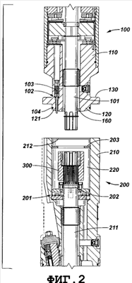 При сборке сдвоенного двигателя с использованием двух секций, проиллюстрированных на фиг.7, основание 100 верхнего сдвоенного двигателя находится в контакте с головкой 200 нижнего сдвоенного двигателя, как показано на фиг.8. Масляный сообщающий клапан 102 позволяет маслу течь в обоих направлениях, от верхнего сдвоенного двигателя к нижнему сдвоенному двигателю, или же от нижнего сдвоенного двигателя к верхнему сдвоенному двигателю. Ряд механизмов уплотнения, включая кольцевое уплотнение 170 на связном клапане 102 и манжетное уплотнение 160 на валу 101, гарантирует, что масло протекает только через связной клапан 102 и не вытекает из соединения сдвоенного двигателя. Эти механизмы уплотнения служат также для удержания как можно большего количества масла в основании 100 верхнего сдвоенного двигателя перед его соединением с головкой 200 нижнего сдвоенного двигателя, оставляя меньше возможностей для захвата воздушных карманов при соединении двух секций. Выступающий элемент 120 вытесняет масло из полости 220 в головке 200 нижнего сдвоенного двигателя, не допуская захвата воздушных карманов.