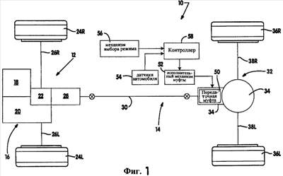 На фиг.1 также показано, что приводная кинематическая цепь 10 дополнительно содержит систему передачи мощности с электронным управлением, позволяющую водителю транспортного средства производить выбор фиксированного (“на часть времени”, временного) режима привода на четыре колеса или адаптивного (“по запросу”) режима привода на четыре колеса. Для этого устройство 34 передачи мощности оборудовано передаточной муфтой 50, которая может быть избирательно приведена в действие для передачи крутящего момента от карданного вала 30 на задний осевой комплект 32 для обеспечения режимов фиксированного (временного) привода или привода по запросу на четыре колеса. Система передачи мощности дополнительно содержит приводной исполнительный механизм 52 муфты для приведения в действие передаточной муфты 50, датчики 54 транспортного средства, предназначенные для обнаружения (измерения) некоторых динамических и рабочих характеристик автомашины 10, механизм 56 выбора режима, позволяющий водителю транспортного средства выбирать один из возможных режимов управления автомобилем, и контроллер (блок управления) 58 для управления приведением в действие (срабатыванием) муфты 52 исполнительного механизма в ответ на входные сигналы от датчиков 54 транспортного средства и селектора 56 режима.