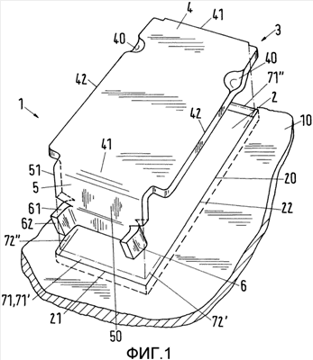 Направляющие лапки 5 ориентированы параллельно друг другу, а также параллельно коротким сторонам 21 четырехугольника. Между направляющими лапками 5 и короткими сторонами 21 отверстия предусмотрены щели 71′, 71 . Благодаря этим щелям 71′, 71 корпус клапана из-за заклинивающего перекашивания не может жестко располагаться на кромке 20 отверстия. В том случае, если одна направляющая лапка 5 прилегает к кромке 21 отверстия у щели 71 , то другая щель 71′ максимально раскрыта – щель 71. Назначение этой максимальной щели 71 поясняется на основе фиг.4. Вертикальные кромки 51 направляющих лапок 5 проходят по высоте h зон 50 подъема и перпендикулярно к этим двум прямоугольникам, наибольшая диагональ D которых короче длины S соответствующей краевой стороны 22 (на фиг.4 все диагонали имеют одинаковую длину, равную D). Разница между длиной S и диагональю D имеет значение, превышающее 0,3 мм. Предпочтительно эта разница составляет около 1 мм. На длинных краях 22 отверстия также предусмотрены щели 72′, 72 , каждая размером примерно от 0,25 до 1,5 мм, предпочтительно 0,5 мм.