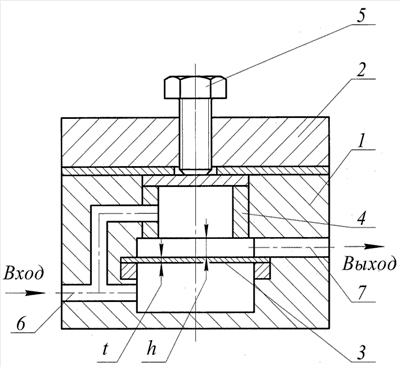 На чертеже представлен заявляемый клапан в разрезе, где 1 – корпус; 2 – крышка; 3 – запорный орган; 4 – седло; 5 – регулирующий элемент, 6 – входной канал, 7 – выходной канал, t – толщина калиброванной мембраны, расстояние между калиброванной мембраной и седлом.