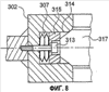 На Фиг.9 детально представлен набор эластичных шайб 307, установленных в углублении 314, выполненном в глубине полости 317 сектора 302. Шайбы 307 сжимаются в углублении 314 толкателем 315, который сам сжимается винтом 313, который сам ввинчивается в корпус сектора 302. Толкатель 315 обладает одной степенью свободы при перемещении относительно сектора 302. Набор эластичных шайб 307 и их направление монтажа позволяет регулировать количество энергии, запасенной в хомуте 300 при его закрывании. В закрытом положении каждый толкатель 315 опирается на корпус затвора 100, 200, не показанных на чертеже, и позволяет освободить энергию, высвобождаемую при открывании хомута 300, для разведения секторов 301 и 302.