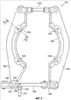 Вторая тяга 304, называемая открывающей, позволяет экстренно открывать хомут 300. На каждом из ее концов имеются кулачки 305, 306, каждый из которых смонтирован качающимся в плоскости, образованной обоими секторами 301 и 302. Один из кулачков 306 установлен качающимся на конце соответствующего сектора в плоскости, образованной соответствующими двумя секторами. Один из кулачков 306 установлен качающимся на конце соответствующего сектора в плоскости, образованной двумя секторами. Другой кулачок 305 имеет край 308, опирающийся на полость 309, размещенную с внешней стороны сектора, противоположного предыдущему.