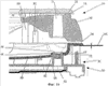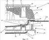 Как проиллюстрировано на фиг.19, отверстия 222 имеют клиновидную форму в поперечном сечении, в силу чего отверстие имеет большую площадь поперечного сечения вверху крышки 220 по сравнению с выпускным отверстием в нижней поверхности крышки 220. Далее, как проиллюстрировано на фиг.18 и 23, форма отверстий может быть описана как D-образная на виде сверху, причем внутренняя граница стенки 224 по отношению к центру блока горелок закруглена, в то время как радиальная наружная стенка 226 – это относительно прямая сторона.