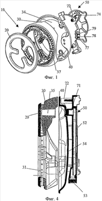 Чашка 40 имеет отверстия 41 и 43, сквозь которые проходят воспламенитель 80 и термопара 81. Хотя и нет необходимости герметизации между воспламенителем 80 и термопарой 81 и относящимися к ним отверстиями 43 и 41, но если желательно, можно использовать уплотнительное кольцо, изолирующую шайбу или иное изолирующее средство.