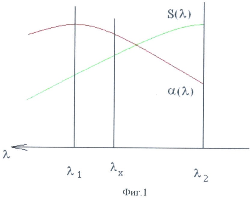 На фиг.1 схематически показаны совпадающие (что не обязательно) спектральные чувствительности приемников S( ) и пропускание фильтра ( ). Рабочий диапазон ( 1– 2) показан вертикальными линиями и находится в пределах монотонного изменения пропускания фильтра и, естественно, ненулевого значения чувствительности приемников. При сформулированных условиях при средней длине волны излучения x отношение величины сигнала приемника в канале с фильтром J2 к величине сигнала приемника в канале без фильтра J1 будет ( x)=J1/J2. Отсюда, поскольку мы знаем спектральное пропускание фильтра ( ), нетрудно определить искомую среднюю длину волны излучения x при помощи выражения х= -1(J1/J2), где -1(а) – функция, обратная к ( ). Подобным же образом можно определить алгоритм действия в случае неидентичных характеристик приемника. В случае немонотонности спектральной зависимости пропускания фильтра на интересующем нас участке, можно использовать дополнительный канал, в котором используется фильтр, спектральная зависимость которого на участке, который выходит за границы рабочего для первого фильтра, является монотонной. В случае необходимости число каналов можно увеличивать далее.