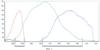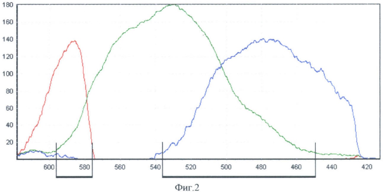 На фиг.2 показано пространственное одномерное распределение сигнала в фотографии спектра лампы накаливания для красных, зеленых и синих сенсоров (обозначены соответствующими цветами) фотоаппарата Sony F717, полученной нами (фирмы-производители не представляют подобной информации). По оси абсцисс отложена длина волны (в нм), по оси ординат – величина сигнала. Отмечены участки цветовой чувствительности (рабочие диапазоны). Следует отметить, что цветопередача фотоаппарата весьма неудовлетворительна, поскольку, например, на интервале 540 нм – 575 нм система совершенно не чувствует изменения цвета. Однако, если измеряемое излучение находится внутри одного из двух отмеченных интервалов, для измерений этот фотоаппарат вполне пригоден. Следует отметить, что мы исследовали около десятка фотоаппаратов разных фирм среднего класса и высшего среднего, и у всех характеристики практически такие же.