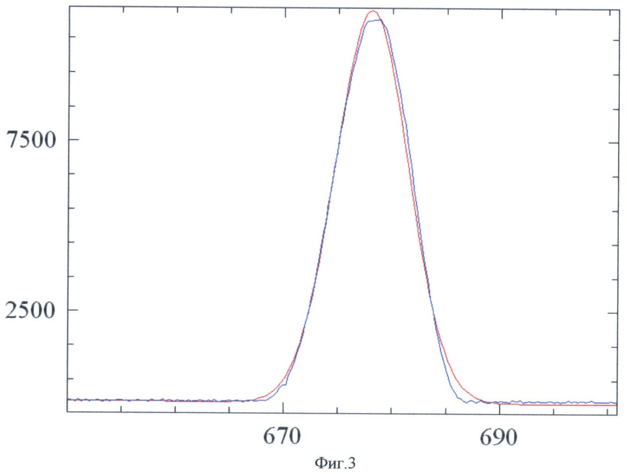 На фиг.3 синяя кривая показывает спектр отражения подобной голограммы для одной из точек голограммы при средней длине волны отражения 677 нм (определяется концентрацией чувствительного вещества), красная – аппроксимацию спектральной линии гауссовой функцией, ширина на половине высоты которой составляет 8 нм.