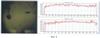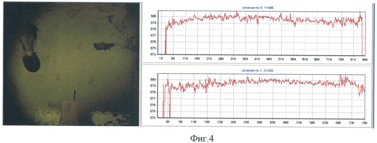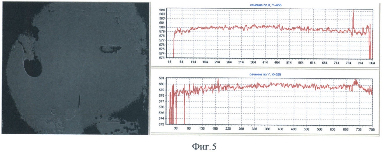 На фиг.4 показана фотография поверхности голограммы при такой концентрации, чтобы средняя длина волны находилась в рабочем диапазоне длин волн. Ниже показаны средние длины волн для проходящих через одну из точек голограммы горизонтального (верхний график) и вертикального (нижний график) сечений. Для этих сечений по оси ординат показаны длины волн, пересчитанные по полученным характеристикам соотношений сигналов в цветных каналах (здесь – красного и зеленого). По оси абсцисс отложены номера пикселей в сечении. Хорошо видно, что средняя длина волны отражения в различных точках находится в интервале 579-580 нм. Этот интервал соответствует близким значениям величин сигналов каналов (зеленый – примерно 80% от красного).
