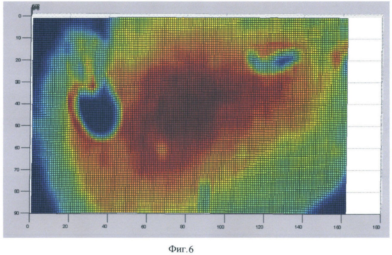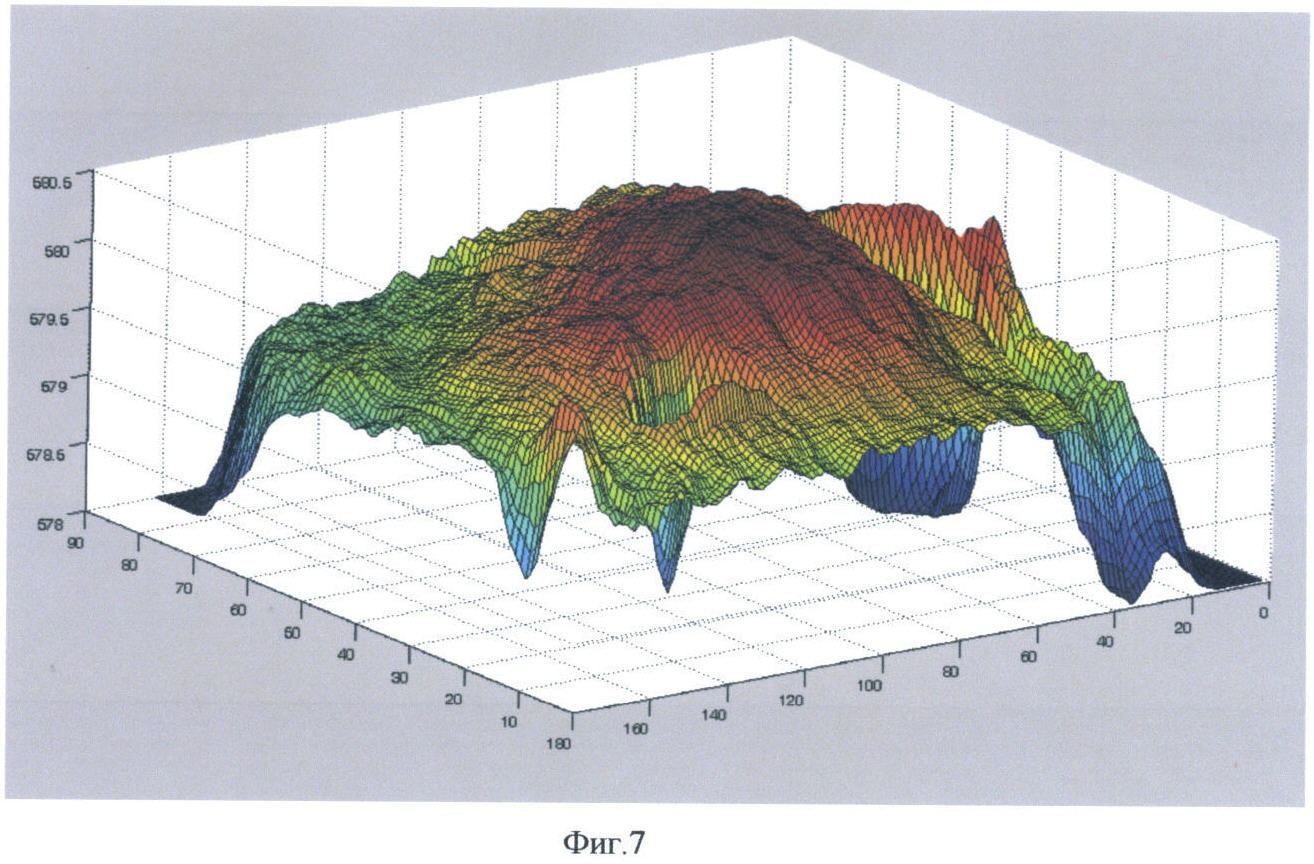 На фиг.6 показана та же карта в условных цветах, а на фиг.7 – изометрия этого распределения, повернутая для лучшей наглядности вокруг вертикальной оси примерно на 180°. На фиг.6 и 7 выходу соотношений каналов из рабочего диапазона соответствует густой синий цвет.