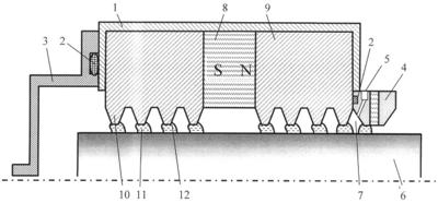 Испытуемый магнитожидкостный герметизатор 1 обычно выполнен следующим образом. К торцам постоянного магнита 8 примыкают полюсные приставки 9. На поверхностях полюсных приставок 9, обращенных к валу 6, выполнены концентраторы магнитного поля 10. Концентраторы 10 образуют с валом зазор 11, заполненный магнитной жидкостью 12.