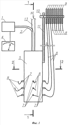 Изобретение поясняется чертежами, где на фиг.1 представлена схема установки, причем для упрощения схемы установки изображение элементов 8 показано с линиями разрыва. На фиг.2 представлен разрез 1-1 фиг.1. На фиг.3 представлен разрез 2-2 фиг.1.