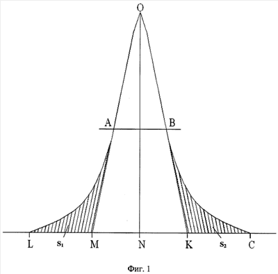 На фиг.1 приведены следующие обозначения: LC – линия фона, ON – линия высоты максимума, ALM и ВКС периферические участки слабой интенсивности дифрактограмм; S1 и S2 соответственно их площади.