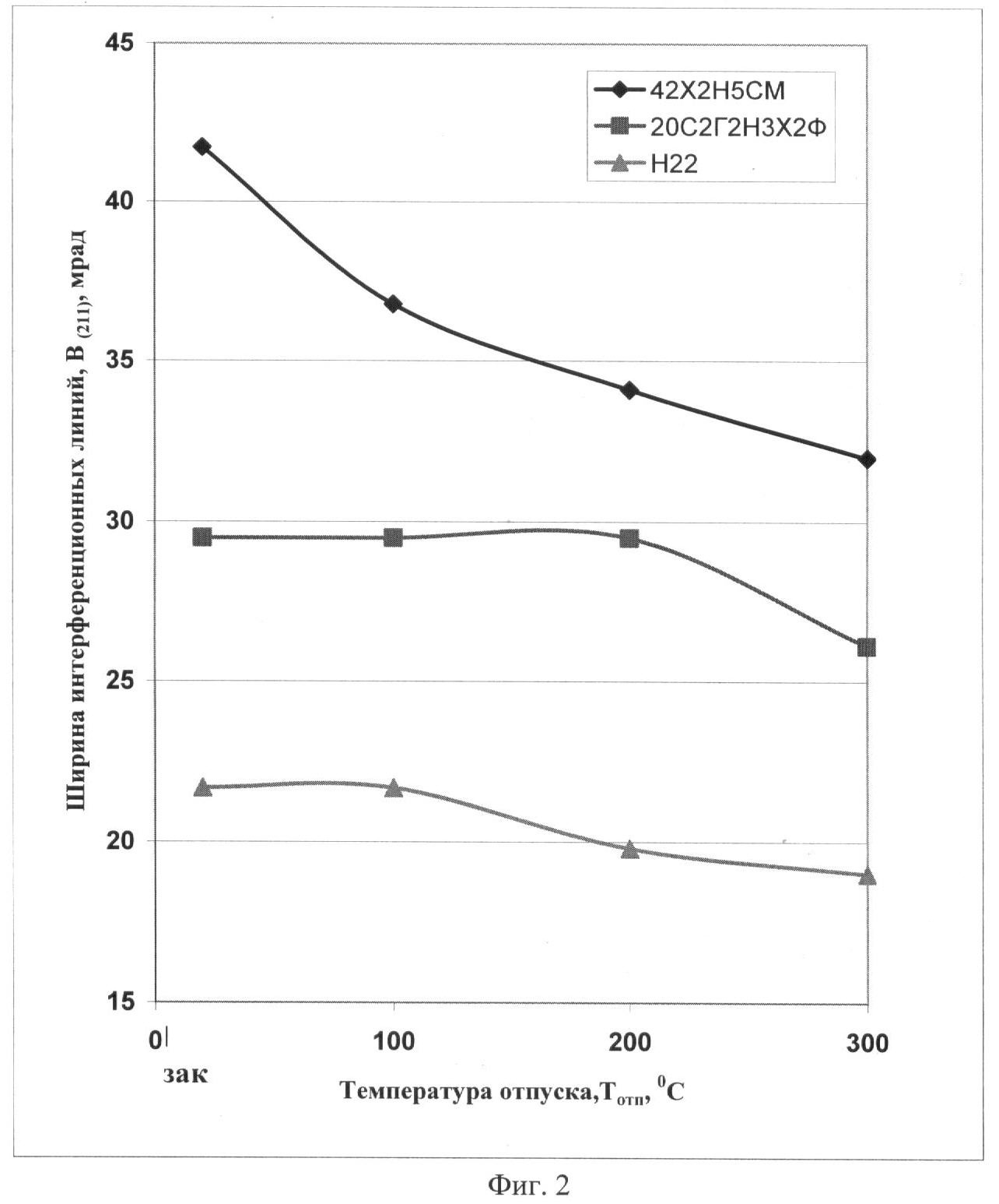 На фиг.2 – зависимость ширины интерференционных линий (211) закаленных сталей 42Х2Н5СМ, 20С2Г3Н2Х2Ф, Н22 от температуры отпуска