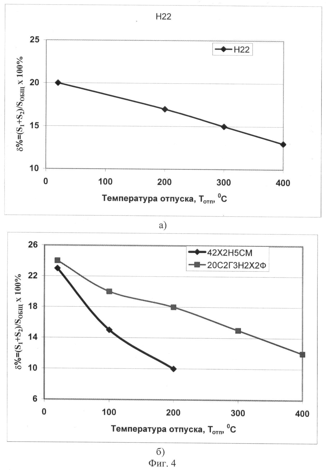 На фиг.4 – зависимость величины % – отношения интегральной интенсивности периферических участков дифрактограммы к общей ее интенсивности ( %=(S1+S2)/Sобщ×100%) закаленных сталей Н22 (а) и 42Х2Н5СМ, 20С2Г3Н2Х2Ф от температуры отпуска.