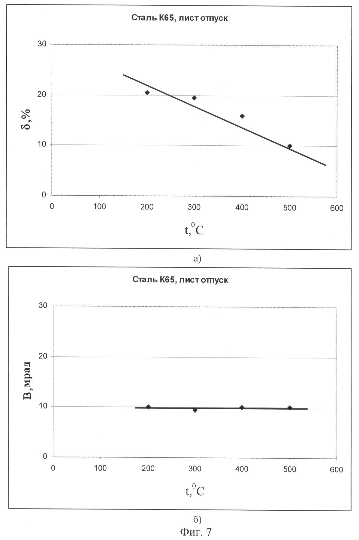 Из фиг.7 следует, что средний уровень микронапряжений (ширина интерференционной линии) практически не изменяется при отпуске, однако величина % с повышением температуры отпуска уменьшается, т.е. происходит релаксация локальной концентрации микронапряжений, способствующая повышению хрупкому разрушению стали.