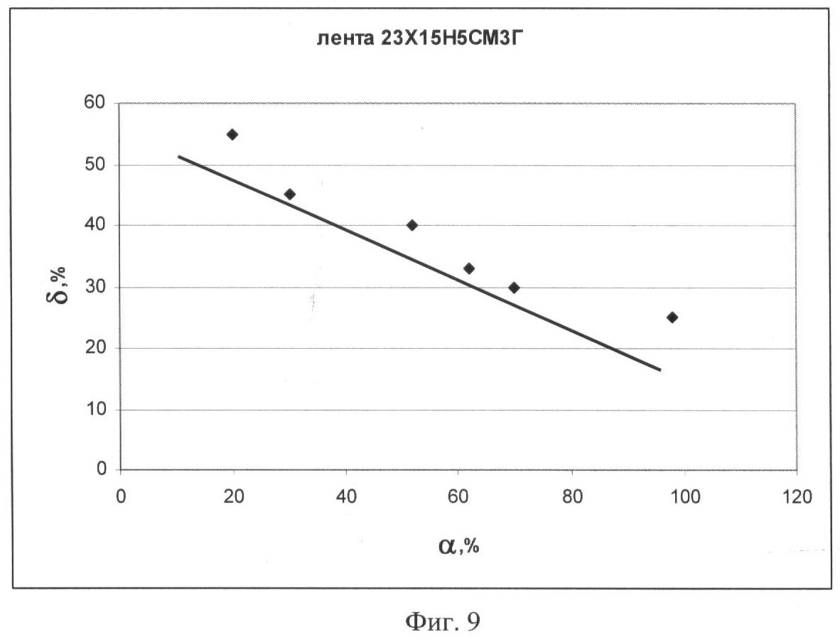 На фиг.9. представлена зависимость значений характеристики локальной концентрации микронапряжений % от количества мартенсита деформации %, образующегося в процессе циклирования при усталостных испытаниях (на базе 107 циклов) холоднокатаной ленты из стали 23Х15Н5СМ3Г.