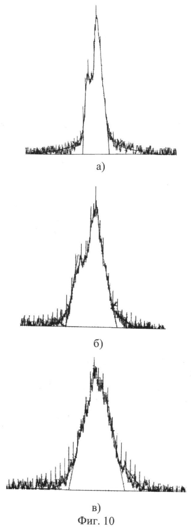 На фиг.10а представлена дифрактограмма стали 14ХГС у кромки излома на внутренней поверхности трубы, значение =30%, т.е. ЛКМ повысилась в два раза по сравнению с исходным состоянием трубы (не эксплуатировавшейся). Это свидетельствует о накоплении дефектов в процессе эксплуатации и, следовательно, должно уменьшиться сопротивление стали хрупкому разрушению. При этом средний уровень микронапряжений практически срелаксирован, о чем свидетельствует разделенный Ка-дублет линии (211) .