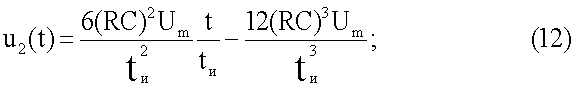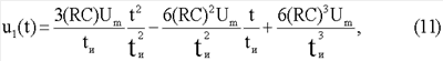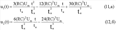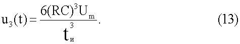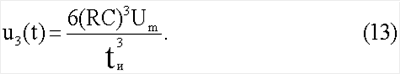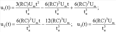 Из (6) видно, что, определив значения амплитуд составляющих импульсов, можно вычислить параметры двухполюсника. Для этого синтезируется компенсирующее напряжение, которое состоит из таких же составляющих, как и напряжение (6) на двухполюснике. Как и в напряжении (6), амплитуды всех составляющих компенсирующего напряжения также должны быть «привязаны» к амплитуде Um импульса генератора. С этой целью импульсы напряжения квадратичной, линейной и прямоугольной формы формируются путем трехкратного дифференцирования кубичного напряжения (1) с помощью второго трехкаскадного дифференциатора. В случае применения в составе дифференциатора идеальных дифференцирующих каскадов с одинаковой постоянной времени напряжения на выходах первого, второго и третьего каскадов имели бы вид соответственно
